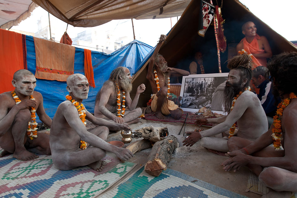 A khumba mela é um momento único para quem quer percorrer o caminho de sadhu ( o caminho reito). Os novos shishya (disciplos) serão então iniciados ao universo dos naga sadhus. Pronto, ápos dias de preparações e rituais, todos estão aguardando a hora H do shahi snaan, o banho dos reis, nas águas de Ganga Maa, purificando assim seus kharmas passados, aspirando de agora pra frente a se dedicar ao caminho espiritual, sob a tutela de seus novos gurus, Amar e Hari Barthi (na foto à esq. de Maharaj), seu irmão de parivaar (família).
